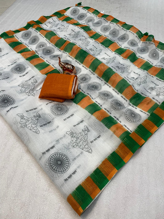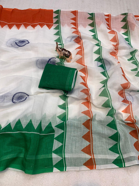 SOFT LELIN LIGHT WEIGHT INDIAN FLAG DESIGN SAREE WITH PRINTED BLOUSE