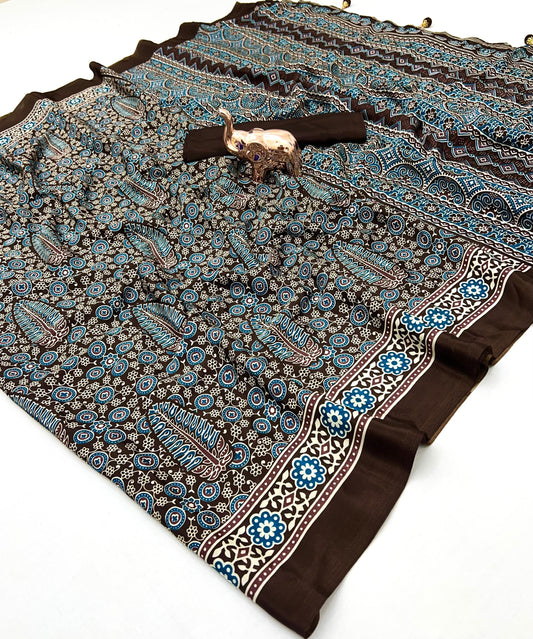 AJRAK PRINTED PURE CRAP SATIN SAREE