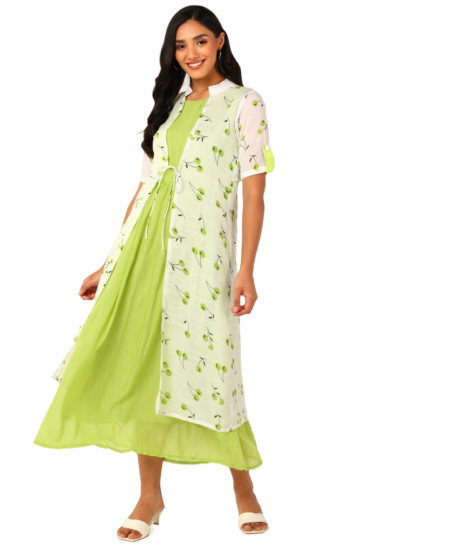 Kurta with Overlay or a Long Jacket Or Shrug with Umbrella Cut Inner Midi Dress