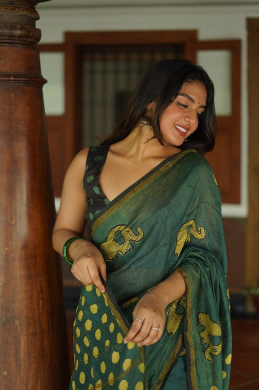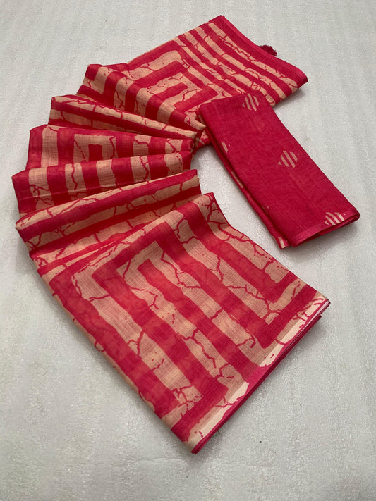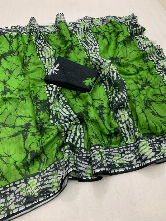 KALAMKARI SOFT LENIN LIGHT WEIGTH PRINTED BATIK SAREE & PRINTEED BLOUSE