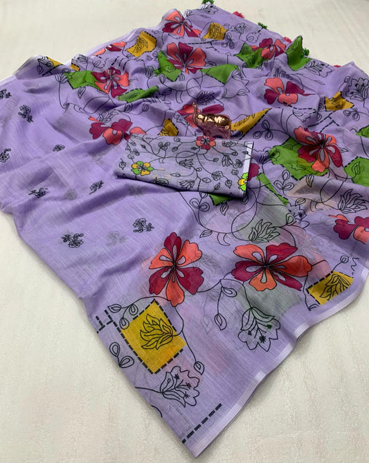 Digital Print, Floral Print, Self Design Daily Wear Linen Saree