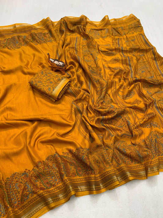 KASHMIRI PURE SOF TUSSER PRINTED SAREE GOLDEN BORDER