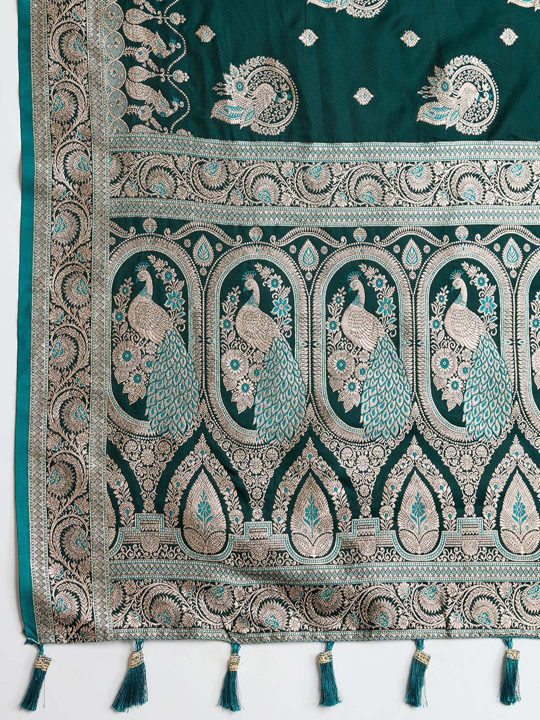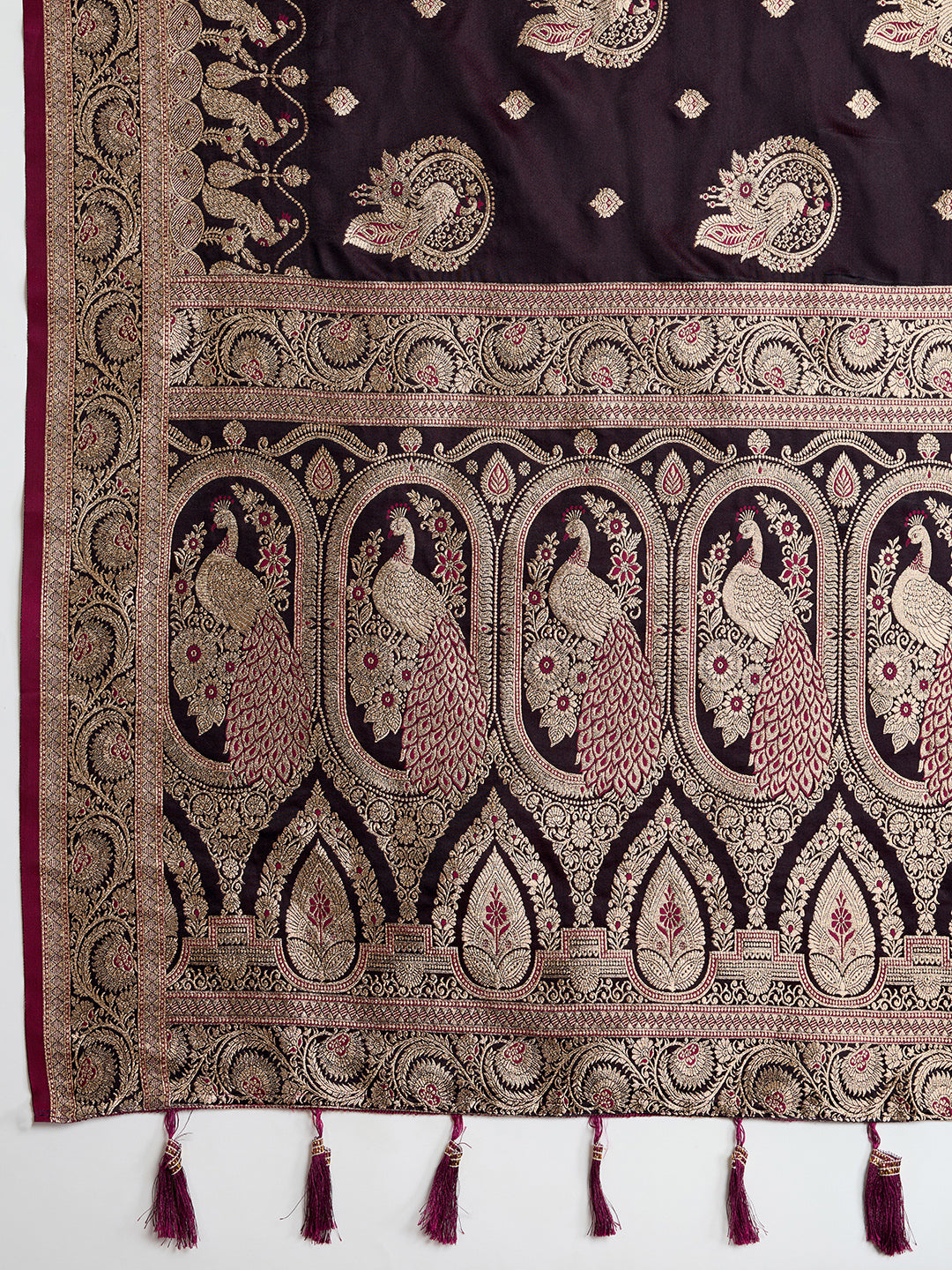 Elevate your ethnic wardrobe with this exquisite peacock, navy blue, dark wine, teal green, maroon Banarasi silk saree, a perfect blend of tradition and elegance. Crafted from luxurious silk, it features intricate zari work that adds a touch of opulence, making it ideal for festive occasions and celebrations. The rich color palette enhances its allure, while the soft drape ensures comfort and grace. Make a statement at your next event with this timeless piece that embodies the essence of Indian craftsmanship.