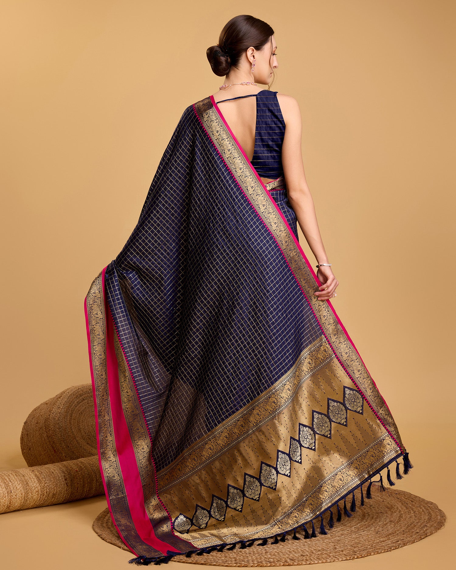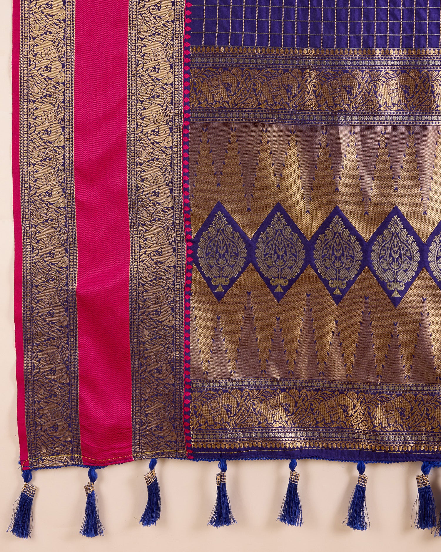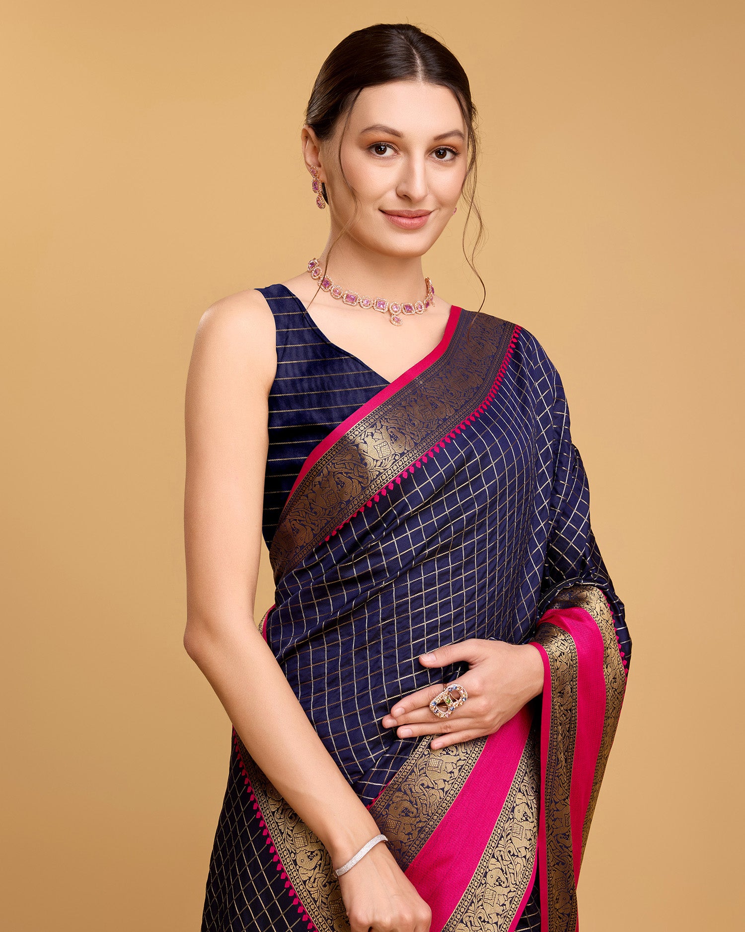 Elevate your wardrobe with this exquisite pink, navy blue, red, dark pink, blue silk sari, designed to make a statement at any occasion. The luxurious silk fabric drapes beautifully, offering both comfort and elegance, while the striking striped border adds a contemporary twist to a classic silhouette. Perfect for festive celebrations or formal gatherings, this sari is a versatile addition to your collection that will surely turn heads and leave a lasting impression. Embrace the vibrant hues and intricate craftsmanship that define this stunning piece, and let your style shine.