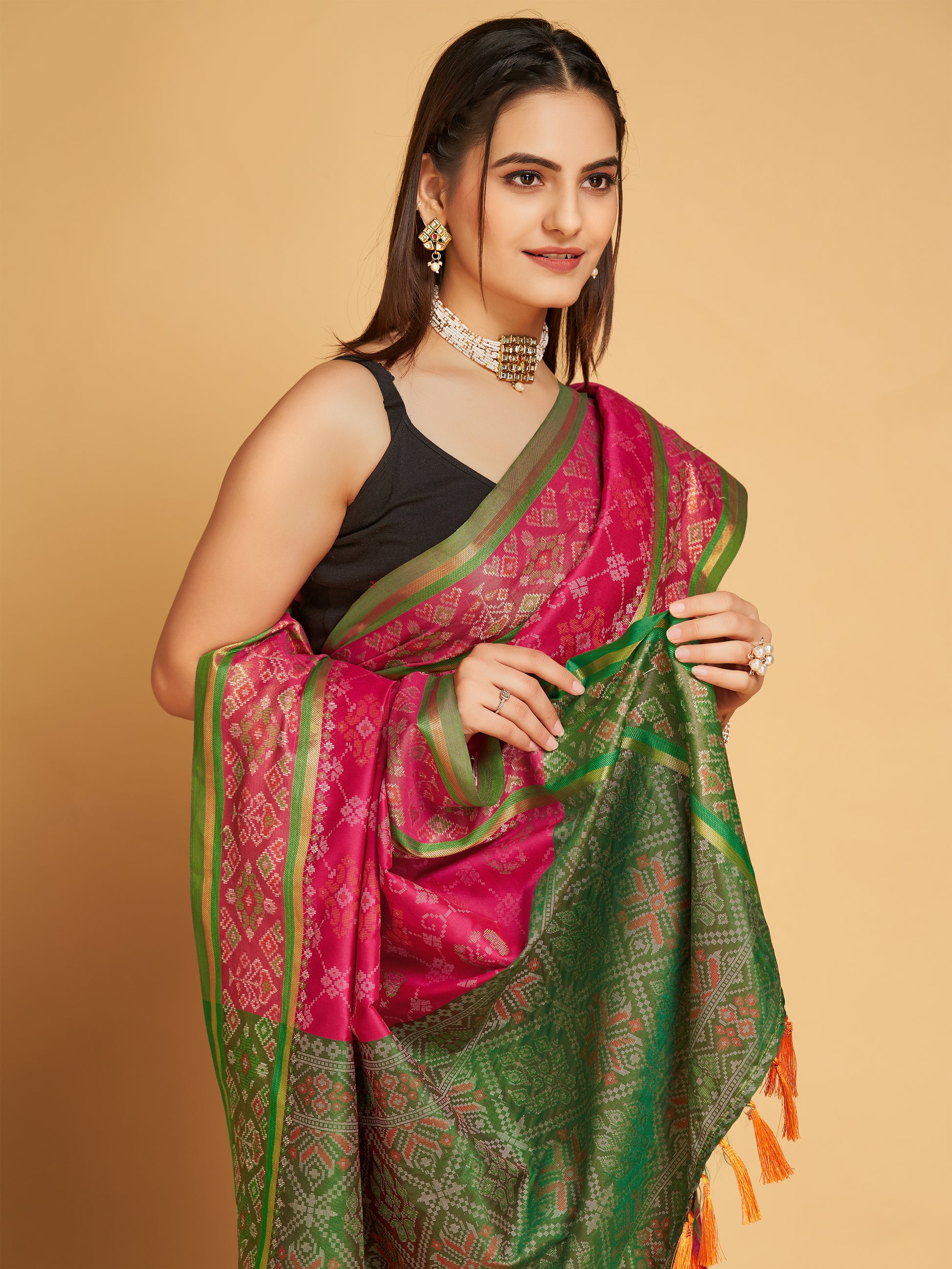 That Are Light On Your Skin And Uplift Your Wedding Shenanigans! Fabric 🧶:- PURE PATOLA SILK SAREE WITH ALL OVER CONTRAST PATOLA