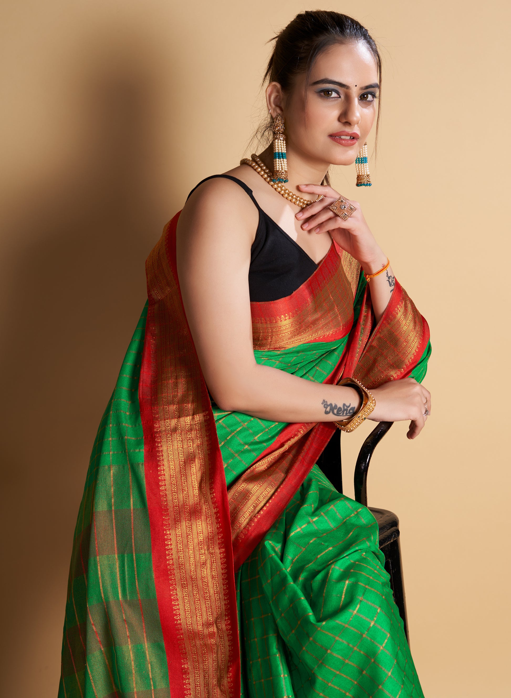 On Premium Soft Silk WITH Contrass pallu and Blouse. For your upcoming festive or party or marriage entry....💁🏻🌷🧚🏻♀ 🥻Saree Fabrics🧶 :- Soft Silk 👕BLOUSE:- Running All Over Contrass Elevate your wardrobe with this exquisite green and red silk sari,